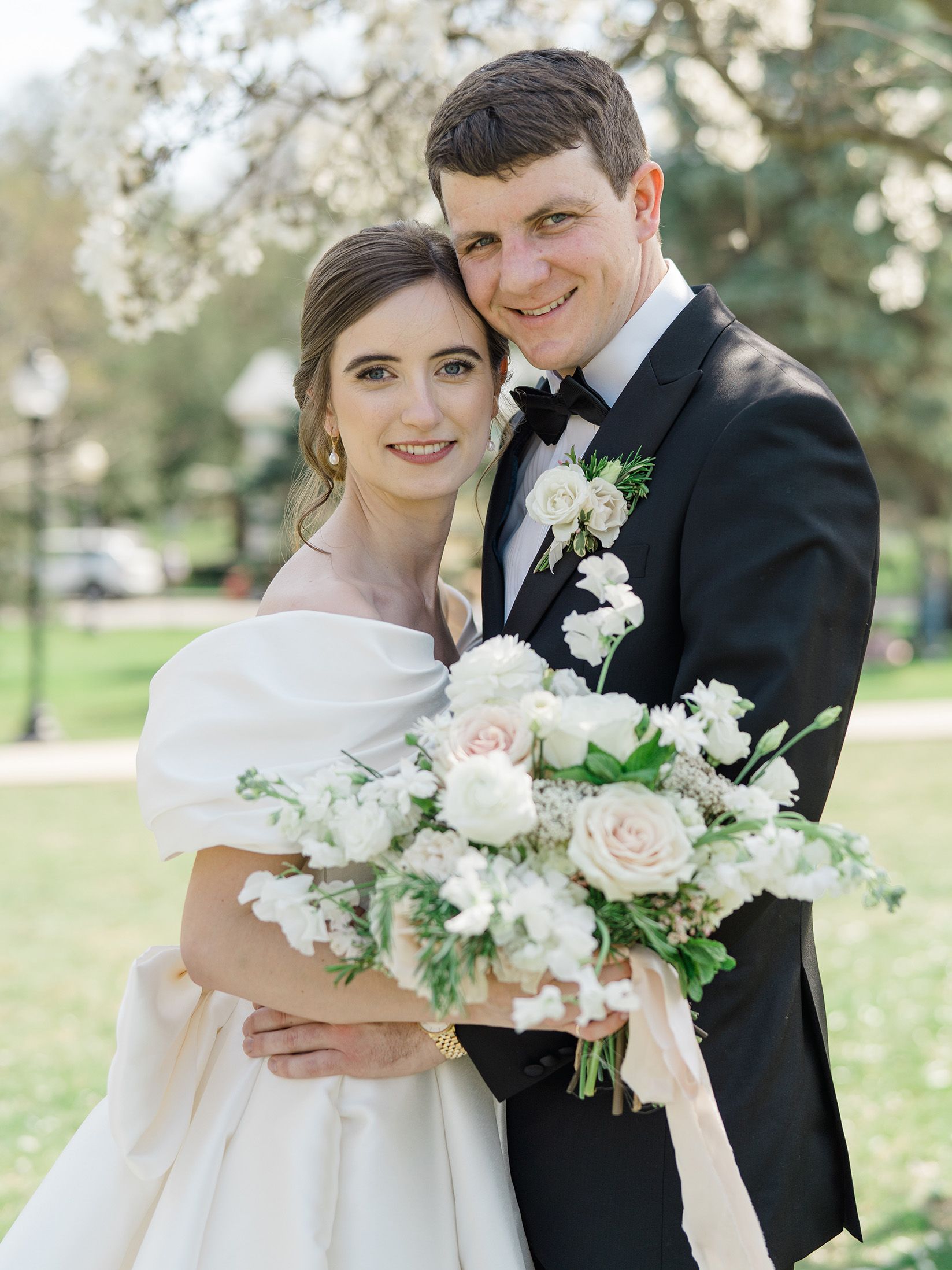 Marisa is a food photographer and recipe developer, and both Chip and Marisa love to garden. As a nod to this, potted herbs were used as decor throughout, and the florist incorporated herbs into the centerpieces and Marisa’s bouquet and Chip’s boutonnière. The mint in Marisa’s bouquet grew roots and will now grow for years to come!