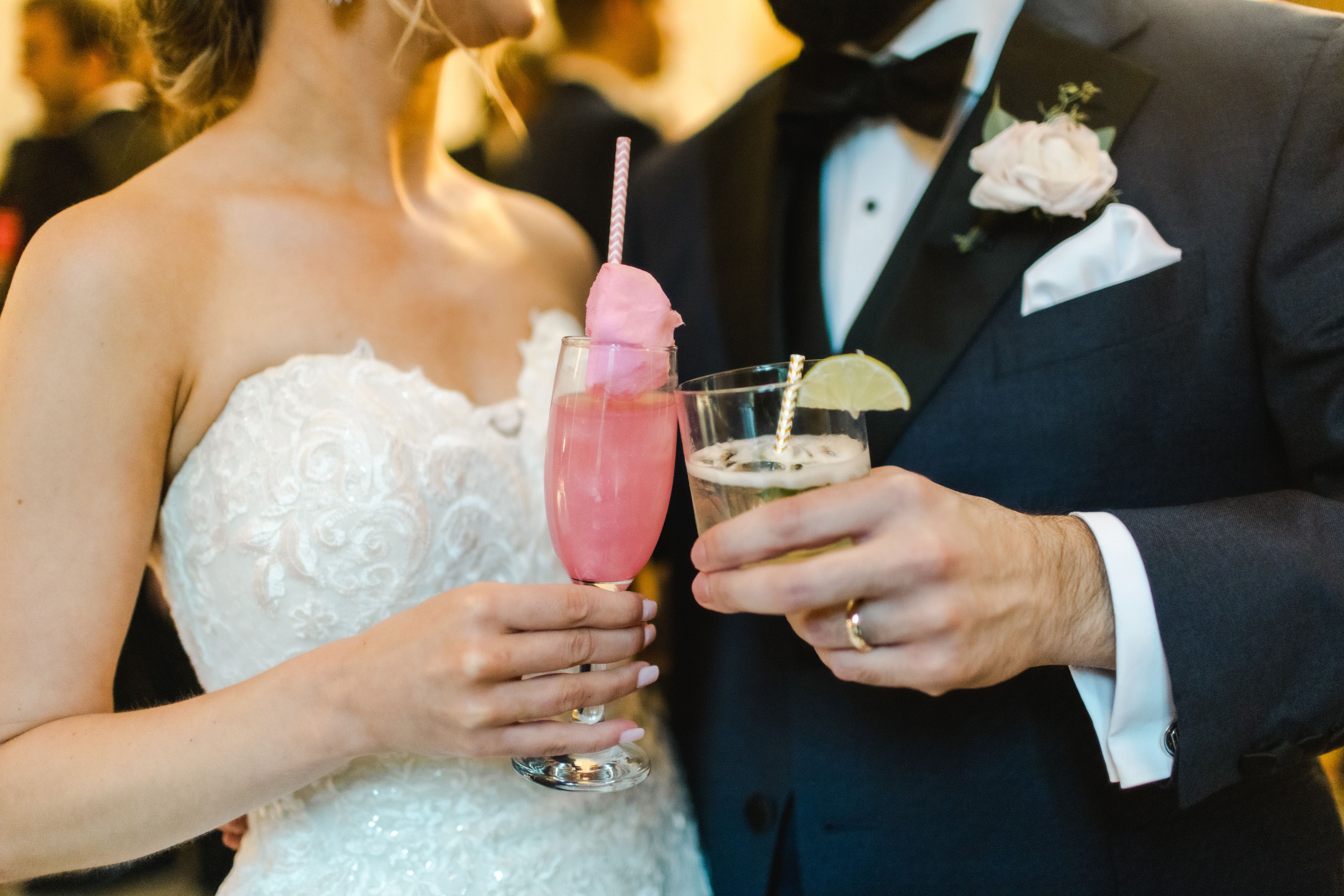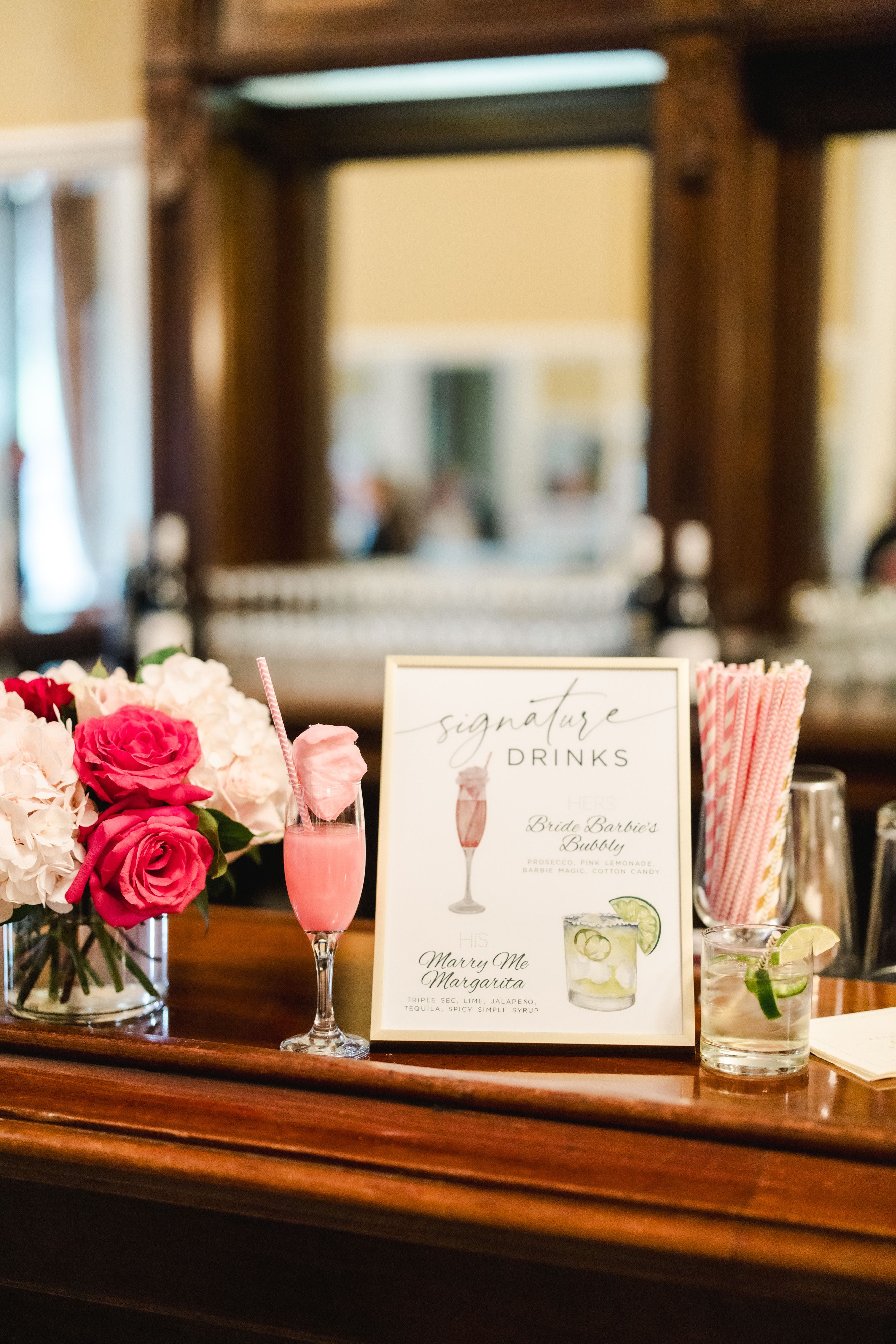 We wanted our signature drinks to reflect our personalities and our love of fun cocktails. The "Bride Barbie's Bubbly" included edible glitter and pink cotton candy, while the groom's "Marry Me Margarita" had jalapeños and a spicy kick!
