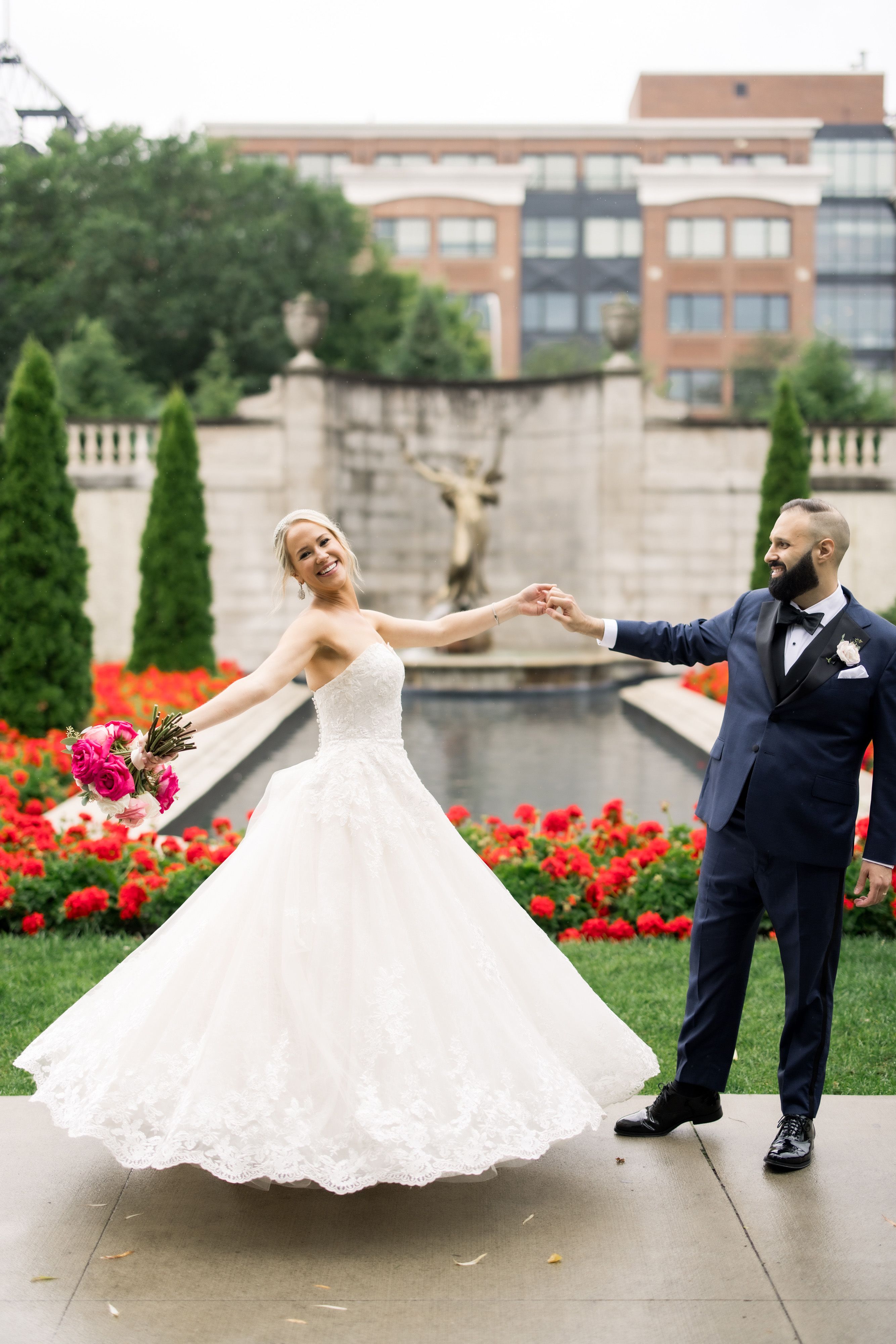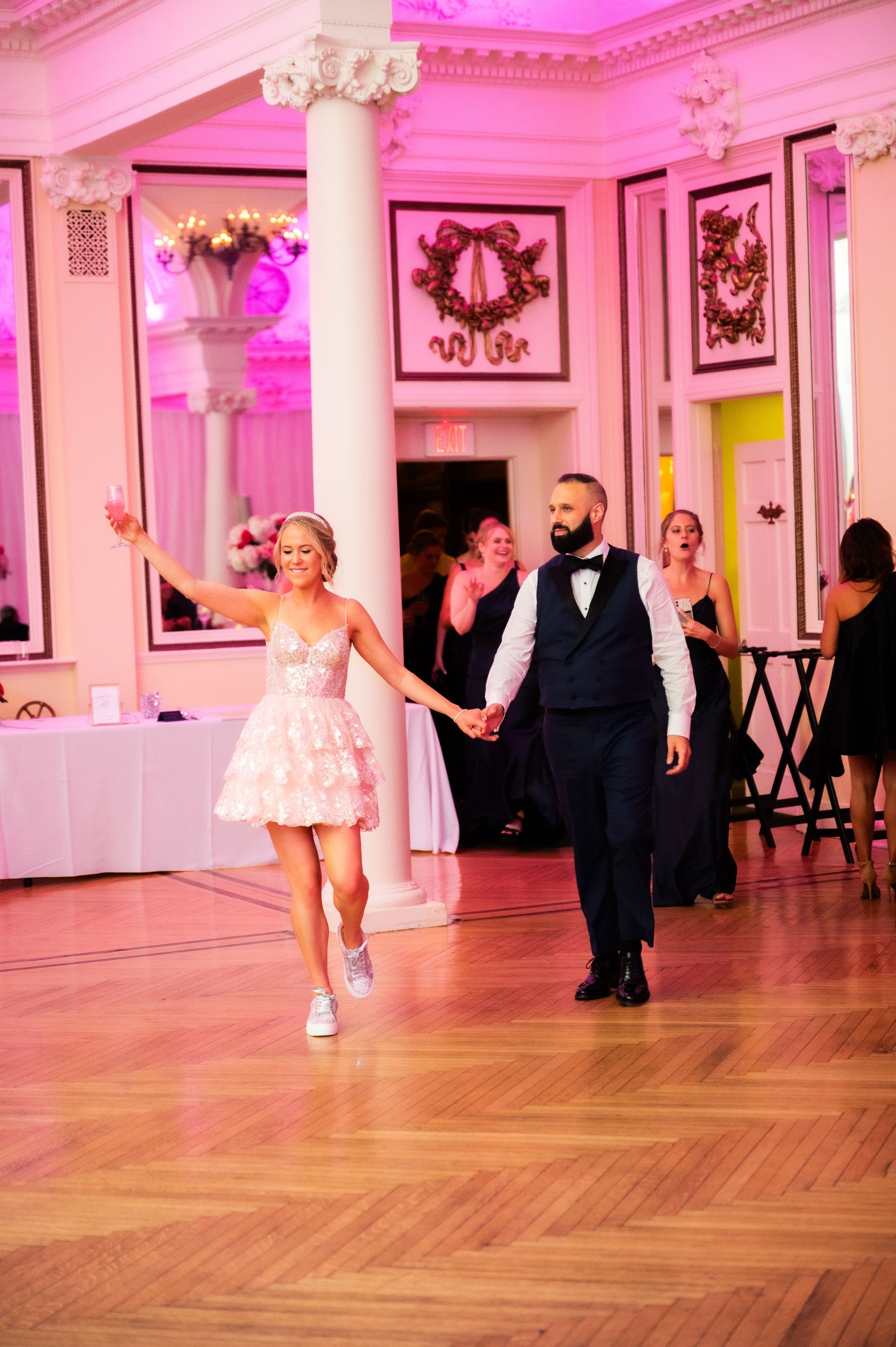 We found some fun ways to incorporate my love of the color pink after everyone had moved to the dance floor. We turned the Casino lights pink, our band members changed into pink dresses and tuxedos, and I changed into a rose-gold sequined dress with sparkly sneakers - it was so much fun!