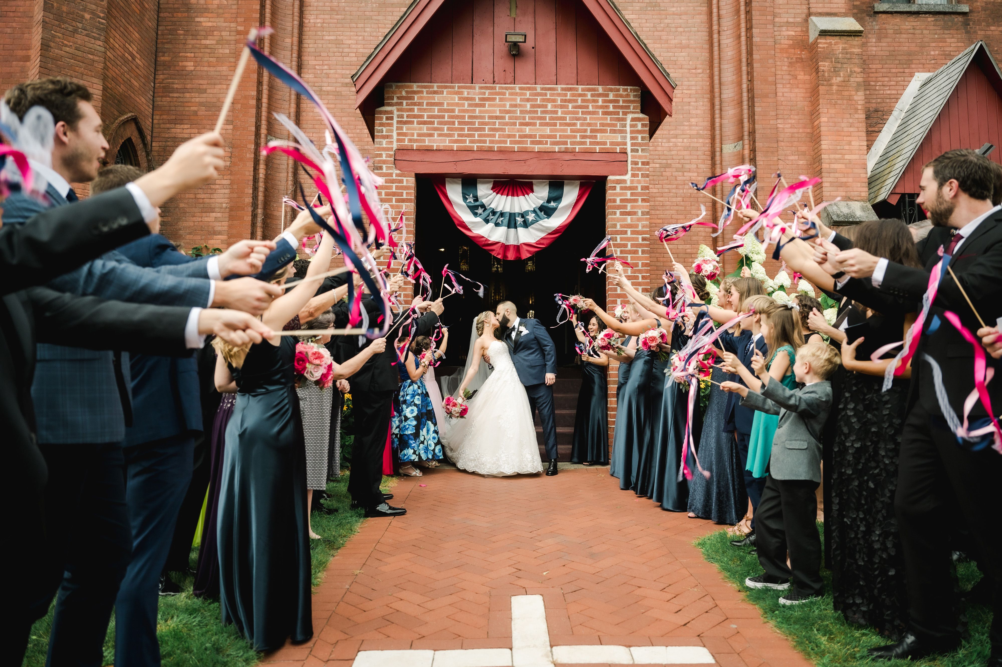 For our church exit, we used wedding wands with streamers in our wedding colors for all our guests to wave. It was so much fun to walk past our family and friends cheering and waving their wands as we got on our trolley!