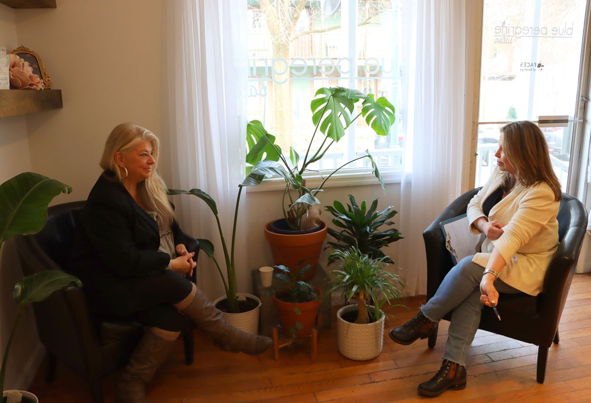 The Blue Peregrine Salon, where Faces of Saratoga is located, is a charming place located at 55 Beekman Street. Crystal meets us at the door. I'm impressed that she takes so much time sitting with Chris for her consultation – something she does with every potential client before any treatment begins. She explains the process and what Chris can expect before, during, and after the triLift session is over.
