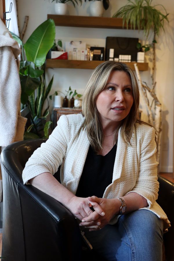 "As we age," Crystal tells us, "our facial muscles tend to loosen—the outer skin layer thins. The triLift procedure helps with all that – without Botox or an invasive surgical procedure that typically comes with a face-lift." She answers all our questions, taking her time to make Chris feel at ease, before pointing out the lady's room, where clients can change into something comfortable.