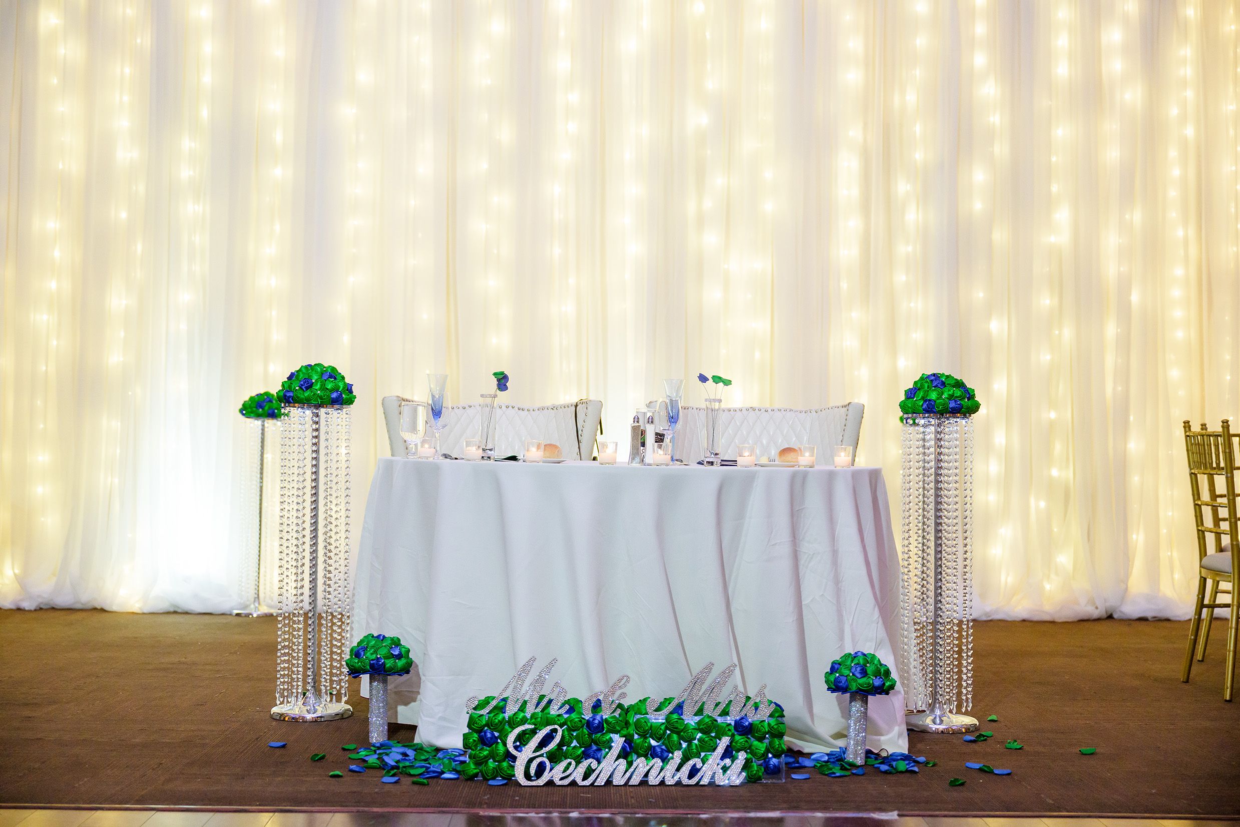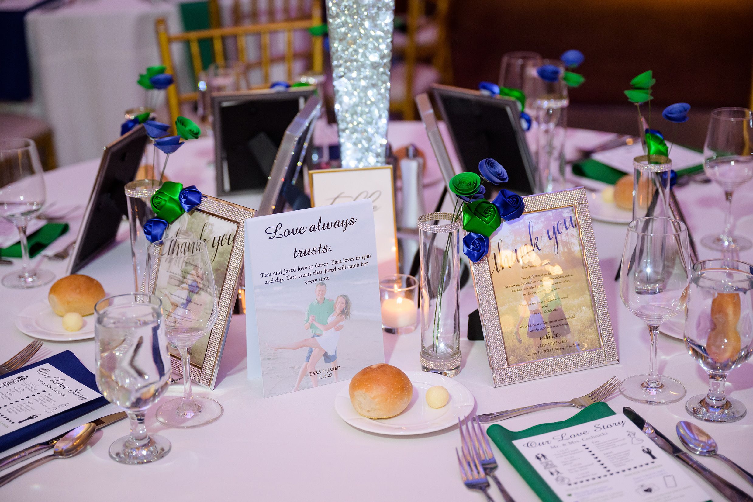 $6.66 was my total when I stopped at Stewart's on my way to our first date. The cashier said "that's unlucky" and I headed off to Starbucks. Then, JARED DIDN'T SHOW UP! Apparently, I never confirmed our date, so Jared thought I changed my mind. We ended up still meeting that night and started dating 17 days later on FRIDAY THE 13th (1.13.17!) In 2021, Jared brought me to Tiffany & Co. to pick out a 1.13 carat diamond. He specifically wanted to get me a 1.13 carat because 1.13 is the day we started dating (1.13.17) & the day we set for a wedding date (1.13.23.) We also text each other hearts at 1:13PM almost daily to let each other know we're thinking about each other. My mother in law read Corinthians 1:13 at our ceremony. In addition, instead of tables numbers at our wedding we had table "love is patient" table "love is kind," etc. Each table tent had a story of when our love was patient, kind, etc. Finally, our wedding hashtag was #TLC113 (because I always said I wanted to marry a man with the last name of C so my initials would be TLC) so our hashtag was #TLC113. We chose the colors blue and green because in our song "Die a Happy Man" Thomas Rhett says "If I never get to see the Northern Lights I could die a happy man." Therefore, our colors were blue and green! Our wedding day was a picture perfect fairytale and completely US.