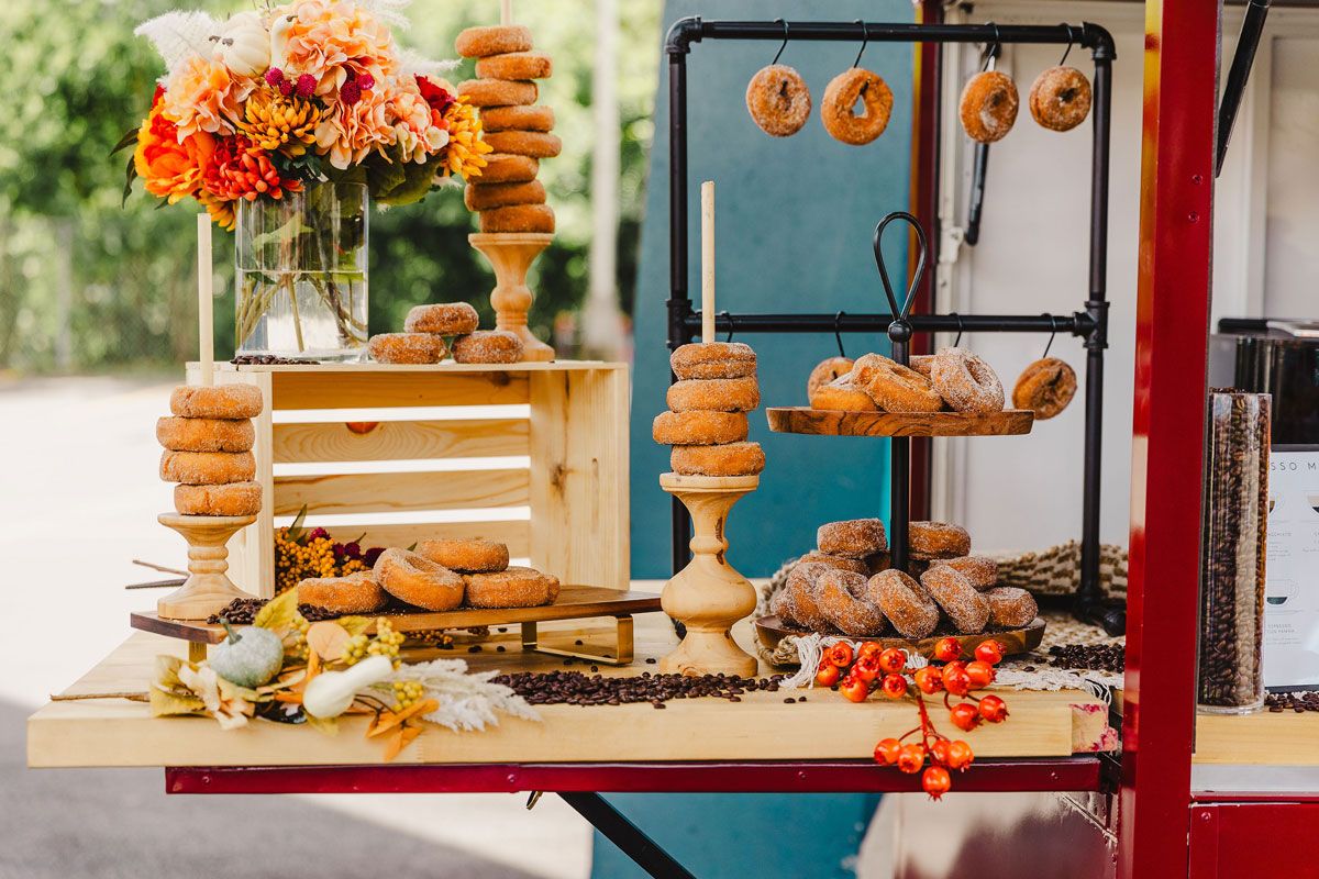 Perfect for autumn weddings, the Dessert Bar features cider donuts from Kinderhook, sweet pastry skewers, pretzels, and more.